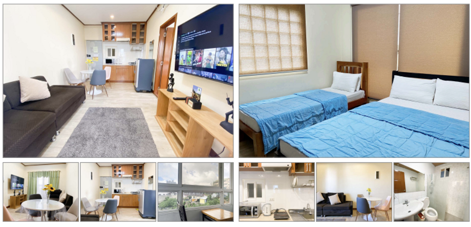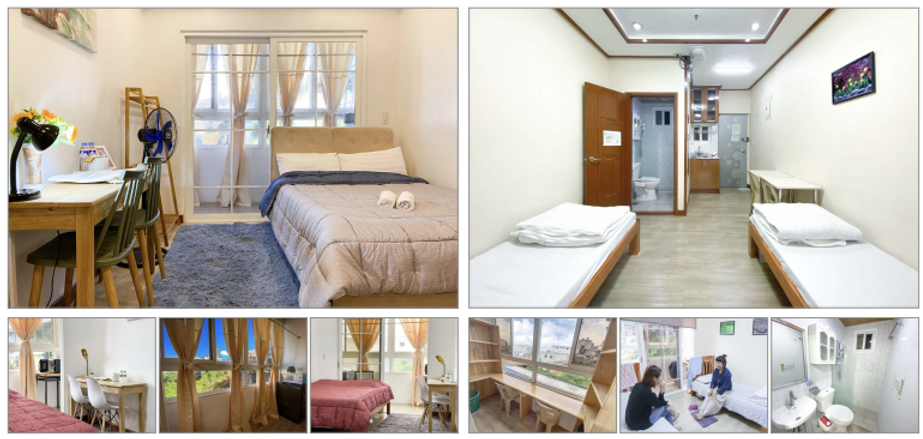 สิ่งอำนวยความสะดวก : เตียงนอน, โต๊ะ, เก้าอี้, ตู้เย็น, กาต้มน้ำ, ไมโครเวฟ, เตาไฟฟ้า, ทีวี, ไดร์เป่าผม